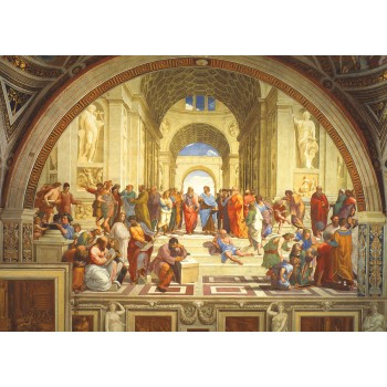 Atina Okulu (1509-1511: Scuola di Atene): Rafaello, bu fresk eserinde felsefe ve astrolojiyi teoloji ile birlikte ele alan Atina Okulu’nun düşünürlerini bir arada ele almıştır. Resimde yer alan düşünürlerden hareketle, “gramer, retorik, diyalektik, müzik, aritmetik, geometri ve astronomi” bilimlerinin Atina Okulu’nun temel tartışma dünyası olduğu görülecektir. Eser Vatikan’da “Stanza della Segnatura” Müzesi’nde bulunmaktadır. Resimdeki, Platon ve Aristoteles gibi bazı filozofların kimlikleri bellidir. Bunun ötesinde, Raffaello figürlerinin kimlikleri her zaman tahminlerin ötesine geçememekle birlikte, bunların “1: Kıbrıslı Zenon, 2: Epikür, Büyük olasılıkla, Rönesans dönemindeki tipik bir figür olarak iki filozof resmi: “Ağlayan” filozof Heraklitos ve “gülen” filozof Demokritos, 3: bilinmeyen (Raffaello olduğu düşünülen), 4: Boethius veya Anaksimandros veya Empedokles, 5: İbn Rüşd (Averroes), 6: Pisagor, 7: Alcibiades veya Büyük İskender, 8: Antisthenes or Xenophon or Timon, 9: Raphael, Aşk’ın kişileştirilmesi olarak Fornarina veya Francesco Maria della Rovere, 10: Aeschines veya Xenophon, 11: Parmenides (Leonardo da Vinci), 12: Sokrates, 13: Heraklitos (Michelangelo), 14: Platon (Leonardo da Vinci), 15: Aristoteles (Giuliano da Sangallo), 16: Diyojen, 17: Plotinos (Donatello), 18: Öğrencileriyle Öklid veya Arşimet (Bramante), 19: Strabon veya Zoroaster (Baldassare Castiglione), 20: Batlamyus, Rapelles (Raphael), 21: Protogenes (Il Sodoma, Perugino veya Timoteo Viti)” olduğu iddia edilmektedir.